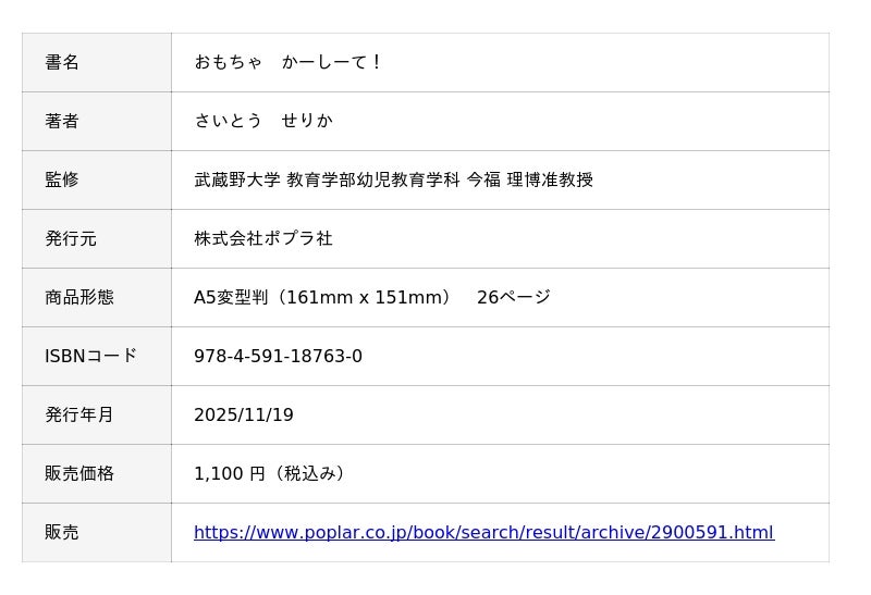 【武蔵野大学】武蔵野大学教育学部幼児教育学科 今福 理博准教授が監修! 泣く・おこる・かむ じゃなく二語文「おもちゃ かして」が言える! 絵本『おもちゃ かーしーて!』が株式会社ポプラ社から発行