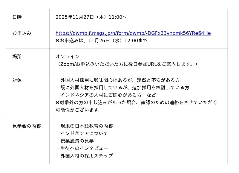 パーソルグループで外国人材に特化した人材サービスを提供するPERSOL Global Workforce(パーソル グローバルワークフォース)株式会社(本社:東京都港区、代表取締役社長:多田 盛弘)は、2025年11月27日(木)に、インドネシアの現地日本語教育施設をオンラインで繋ぐ、オンライン見学会を開催します。「外国人材採用に興味はあるが、どんな人材かわからなくて不安」、「外国人材採用を検討している」という方々は、ぜひご参加ください。