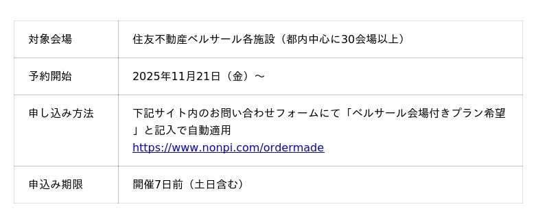 ノンピが実施した自社アンケートでは、幹事の70%が「会場選びが一番大変」と回答しており、年末のイベントシーズンを迎える企業の課題に応える形での新プランです。