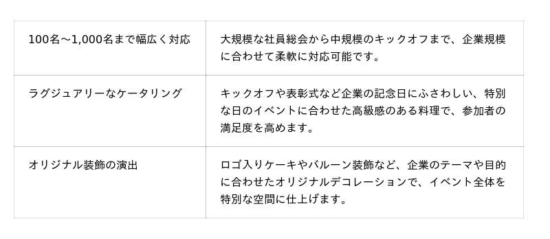 「会場+ケータリングセットプラン」は、忘年会・納会・表彰式・キックオフ・社員総会など、さまざまな法人イベントに最適なプランです。