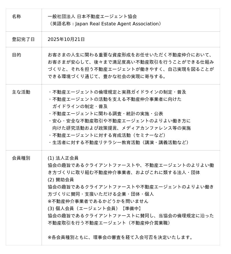 つきましては、不動産エージェントを、真のクライアントファーストを実現し業界の健全な発展に寄与する存在として数多く世に送り出すことを目指し、不動産エージェント倫理規定の制定・普及、および不動産仲介業・関連事業を営む企業・団体同士の連携・共創等の活動を行うために当協会を設立することとなりました。