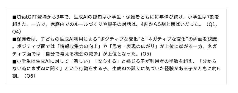 小学生は生成AIに対し、「楽しい」「安心する」と思い、分からない時にまずAIに聞くという行動が日常化し始めています。また、AIの誤りに気づいた子が6割弱にのぼるなど、AIのリスクを意識して活用するリテラシーが育ちつつある様子も見られました。