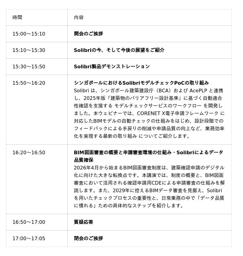 さらに、業界で大きな注目を集めている 2026年春から日本で導入予定のBIM確認申請 について、一般財団法人 建築行政情報センター(ICBA) 大門氏 より詳しく解説していただきます。BIMプロジェクトの品質管理と次世代の確認申請に関心のある皆さま、ぜひご参加ください。