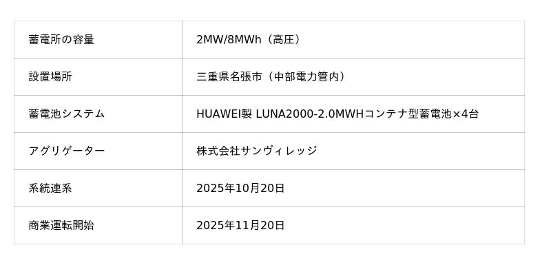 株式会社サンヴィレッジ(本社:栃木県足利市、代表取締役:三村 挑嗣、以下「当社」)は、三重県名張市に建設した当社所有の2MW/8MWh蓄電所が、2025年10月20日に系統連系を完了し、試運転を経て同年11月20日に商業運転を開始しましたことをお知らせいたします。
