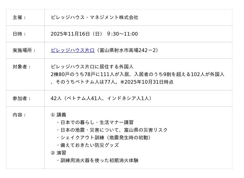 ビレッジハウス・マネジメント株式会社(本社:東京都港区、代表取締役社長兼CEO:岩元 龍彦、以下ビレッジハウス)は、富山県射水市にある「ビレッジハウス片口」に居住する外国人を対象に、日本での安心安全な暮らしを支援することを目的とした地域企業との防災に関する共創プロジェクト、「ビレッジハウス防災イベント@射水」を2025年11月16日(日)に行いました。