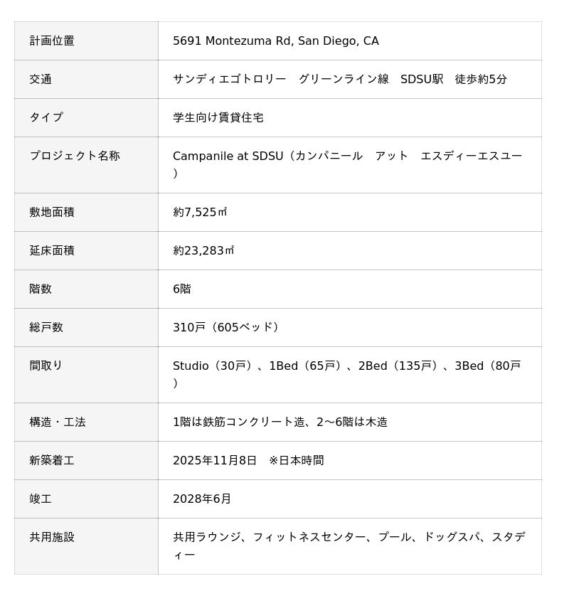 米国カリフォルニア州サンディエゴ市における学生向け賃貸住宅開発事業への参画について
