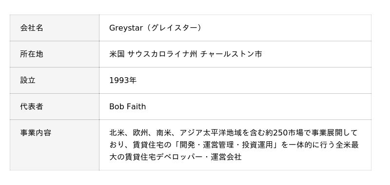 ※ Greystar社は、全米において最も多くの賃貸住宅を保有するとともに、最も多くの新規賃貸住宅(2024年・戸数ベース)を開発している全米最大の賃貸住宅デベロッパーです。