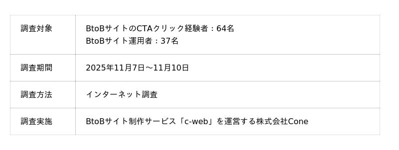 株式会社Cone(本社:大阪府大阪市、代表取締役:佐藤 立樹)は、BtoBサービス企業で働く方を対象に、ウェブサイトのCTA(Call To Action)に関する意識と成果について調査を実施しました。