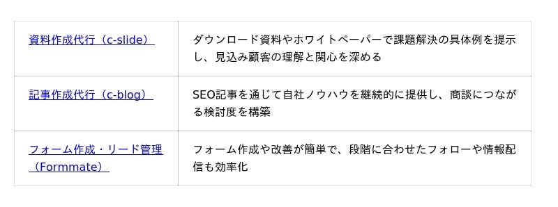 さらに、CTAで獲得したリードを商談まで育てるには、サイト制作後の運用支援も不可欠です。c-webでは、制作後も以下のサービスでリード育成を強化できます。