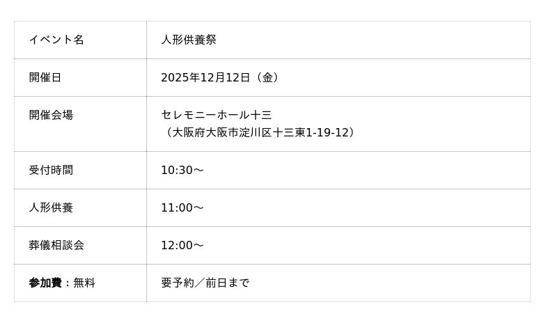 株式会社ベルコ(セレモニーホール十三)は、思い出の詰まった人形に感謝を伝える『人形供養祭』を 2025年12月12日(金) に開催いたします。大切にしてきたぬいぐるみやひな人形、日本人形などを心を込めて供養し、新たな気持ちで手放せる機会として、毎年多くの方に参加いただいている行事です。