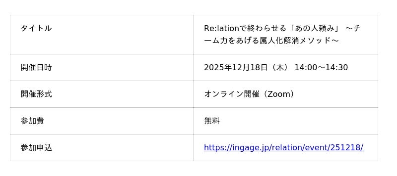 コミュニケーションプラットフォーム「Re:lation(リレーション)」を提供し、6,000社以上(※1)の導入実績を誇る株式会社インゲージ(本社:大阪府大阪市、代表取締役:和田 哲也、以下インゲージ)は、業務の非効率化と生産性停滞の要因となっている「ノウハウの属人化」を解消し、全社的なチーム力を向上させるためのウェビナーを、2025年12月18日(木)に開催することをお知らせいたします。