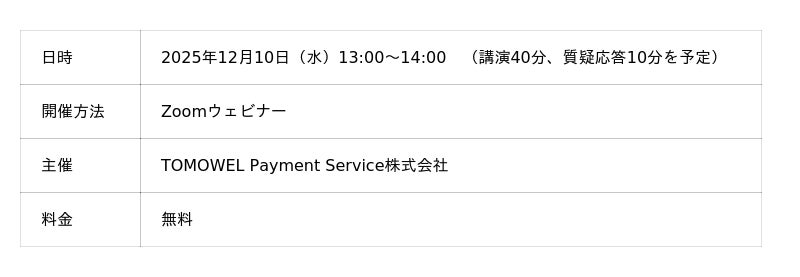 TOMOWEL Payment Service株式会社(所在地:東京都文京区、代表取締役社長 小島 昌也 以下:当社)は、当社が提供する法人プリペイドカード「Bizプリカ(R)」について、2025年12月10日(水)13時から、無料ウェビナー“2026年を「脱・小口現金」元年へ ~「Bizプリカ(R)」活用事例から紐解く経費精算改革~”を開催します。