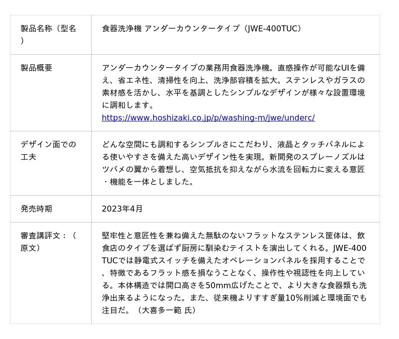 総合フードサービス機器メーカーであるホシザキ株式会社(本社:愛知県豊明市、代表取締役社長:小林靖浩)の食器洗浄機アンダーカウンタータイプJWE-400TUCが、公益社団法人日本インダストリアルデザイン協会(JIDA)が主催する「JIDAデザインミュージアムセレクション Vol.27」に選定されました。