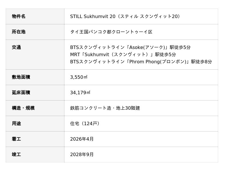 東京建物株式会社のタイ子会社であるTokyo Tatemono (Thailand) Ltd.(以下「東京建物タイランド」)は、タイ・バンコクでラグジュアリークラスの分譲マンション開発事業「STILL Sukhumvit 20(スティル スクンヴィット20)」(以下「本事業」)に参画し、2025年11月よりVIP顧客向けの販売を開始しましたので、お知らせします。