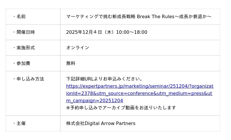株式会社TWOSTONE&Sonsのグループ会社である株式会社Digital Arrow Partners(所在地:東京都渋谷区、代表取締役CEO:佐藤雅樹、以下 Digital Arrow Partners)は、2025年12月4日(木)に「BREAK THE RULES」をコンセプトとしたマーケティングカンファレンス「マーケティングで挑む新成長戦略 Break The Rules~成長か衰退か~」をオンラインにて開催することをお知らせいたします。