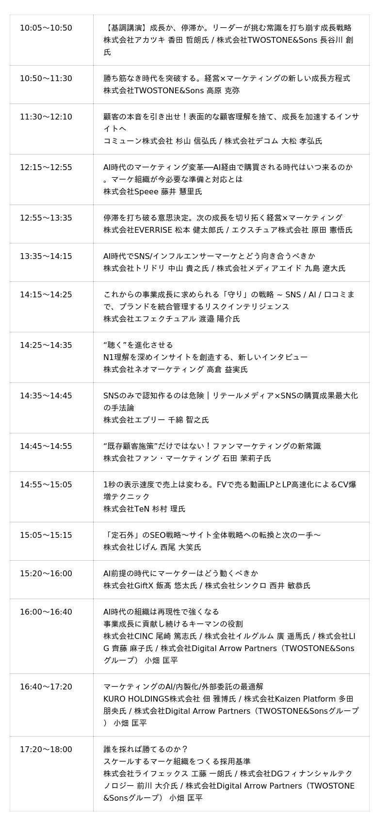 本カンファレンスでは、事業を成長させるための戦略と打ち手、一次情報をもとにした意思決定の考え方、抽象論で終わらせない具体的な実践内容、そして再現性と実現可能性の高い組織・運用モデルの4つの観点から、登壇企業各社が実践知と具体的な解決策を公開いたします。