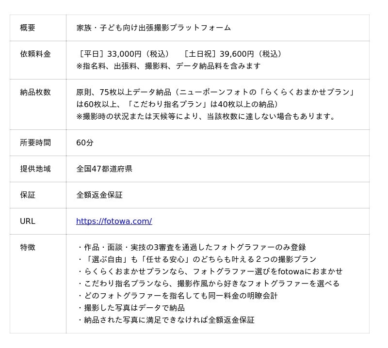 「fotowa」は、撮影して欲しい人とプロのフォトグラファーをつなぐ、家族・子ども向けの出張撮影プラットフォームです。