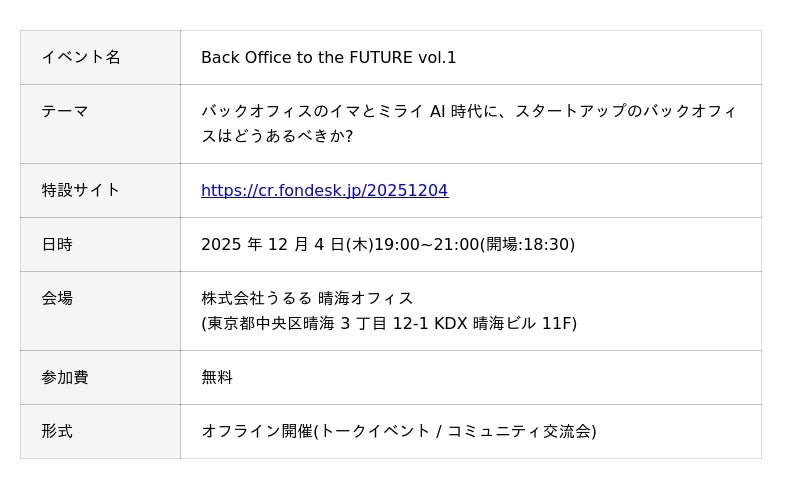 AI 時代にスタートアップのバックオフィスはどうあるべきか?「Back Office to the FUTURE vol.1」12/4(木)開催