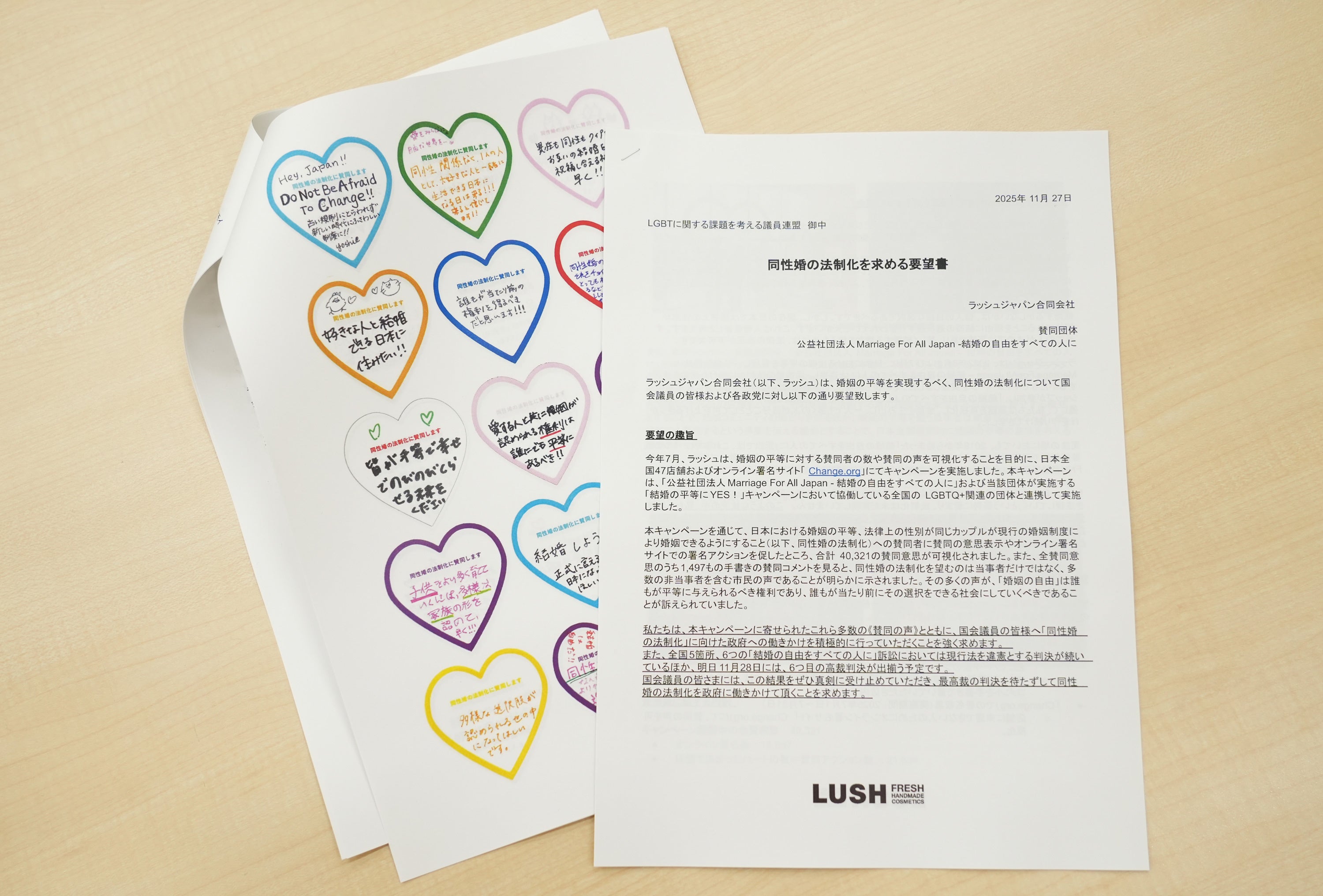 英国発のナチュラルコスメブランドLUSH(ラッシュ)は、本日11月27日(木)、超党派議員連盟「LGBTに関する課題を考える議員連盟」の総会にて、同性婚の法制化実現に向けた国会での審議を求める要望書をラッシュジャパン合同会社として提出いたしました。今回の要望書提出は、2022年より「公益社団法人Marriage For All Japan - 結婚の自由をすべての人に(以下、マリフォー)」と連携し、継続的に婚姻の平等を求めてきたラッシュジャパンが、企業の立場として変革に向けて行動を起こしたものです。
