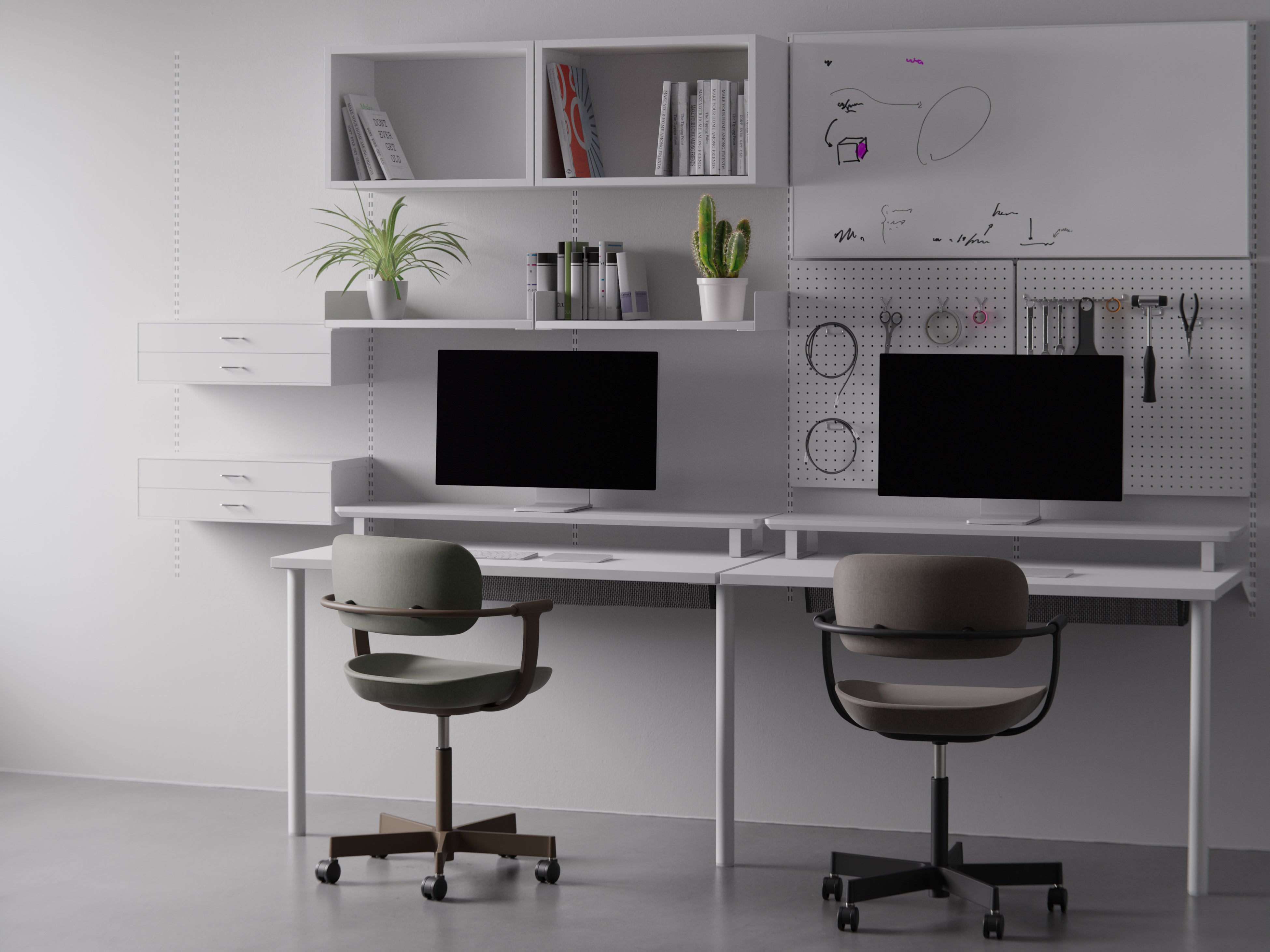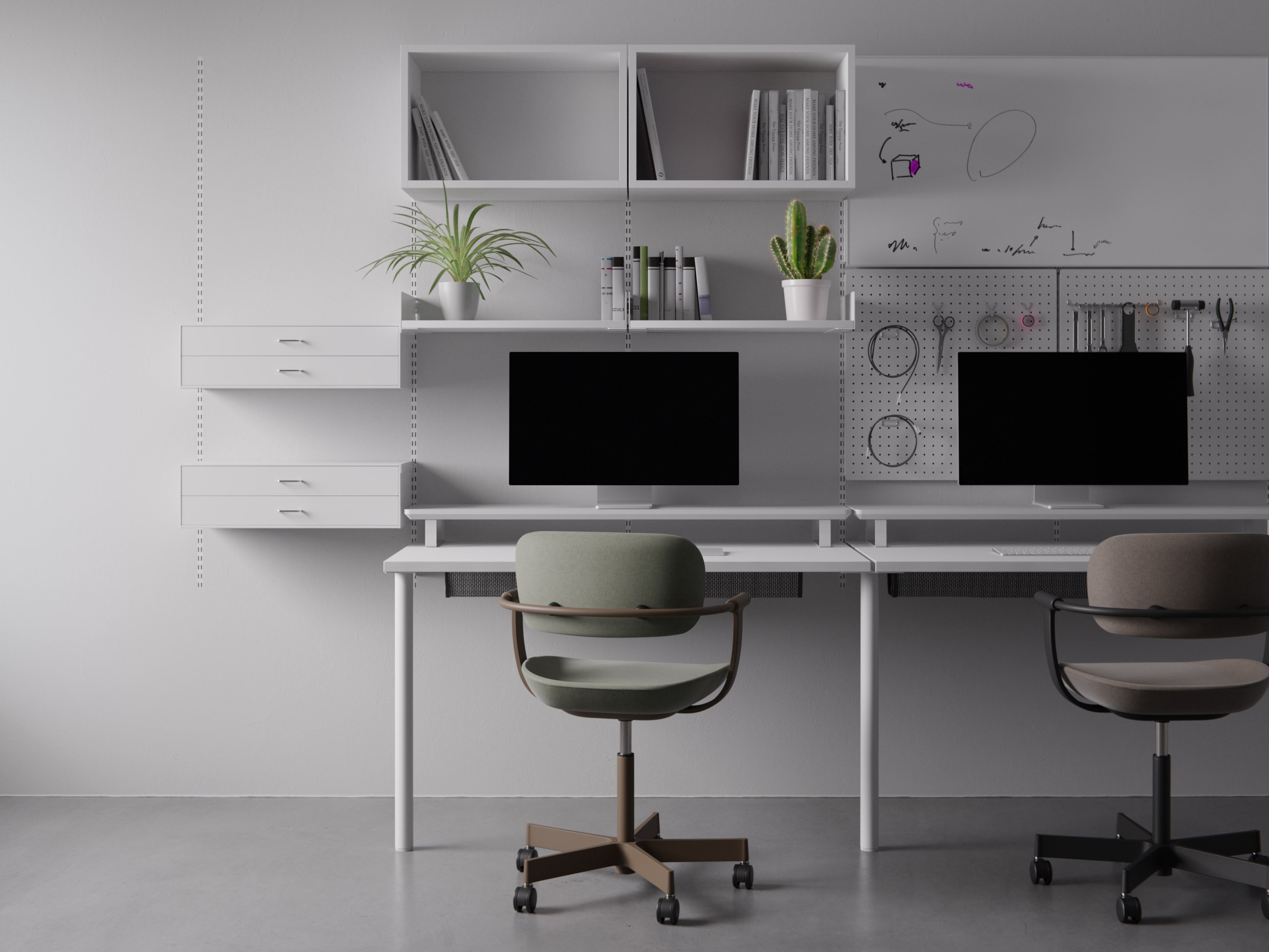 また、限られた空間をより効率的に活用できるように壁面モジュールシステム「WALL MODULAR SYSTEM」を新規開発。収納用のボックスや棚板、ホワイトボードや有孔ボードなどをモジュール化。壁面に埋め込んだレールと組み合わせて高いカスタマイズ性を実現します。