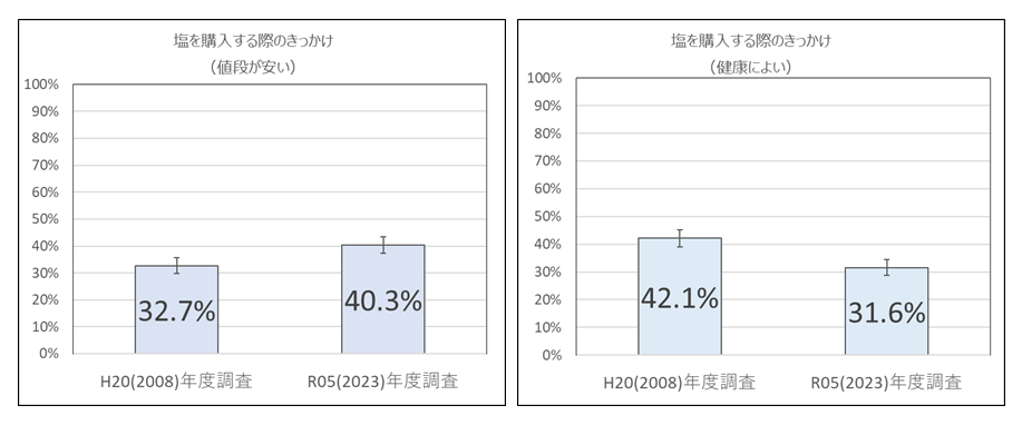 「塩を購入するきっかけ」の質問では、「値段が安い」が伸びており、値段が重視されるようになってきていることが伺えます。一方で「健康に良い」は、減少しています。