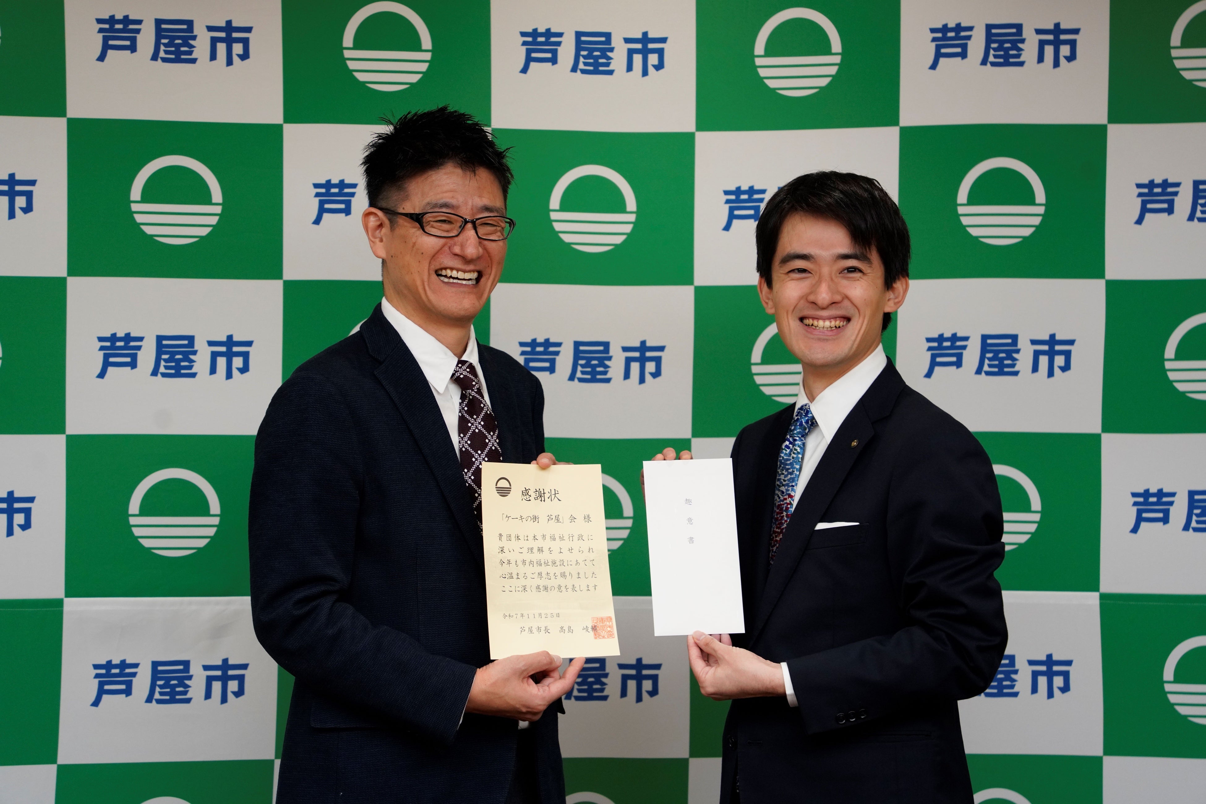 (写真左)感謝状を手にする蟻田剛毅(写真右)趣意書を手にする高島崚輔芦屋市長