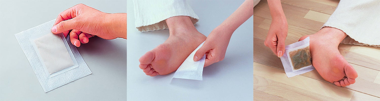 - 樹液シートを固定シートに貼り、足裏などお好きな部位にペタッと貼ります。- そのまま寝て、翌朝シートをはがして洗い流すだけ。