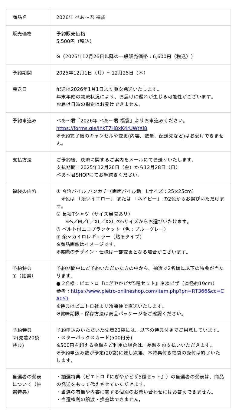 べあ~君福袋2026 予約受付フォーム数量限定100袋・ご予約はお早めにお願いいたします。