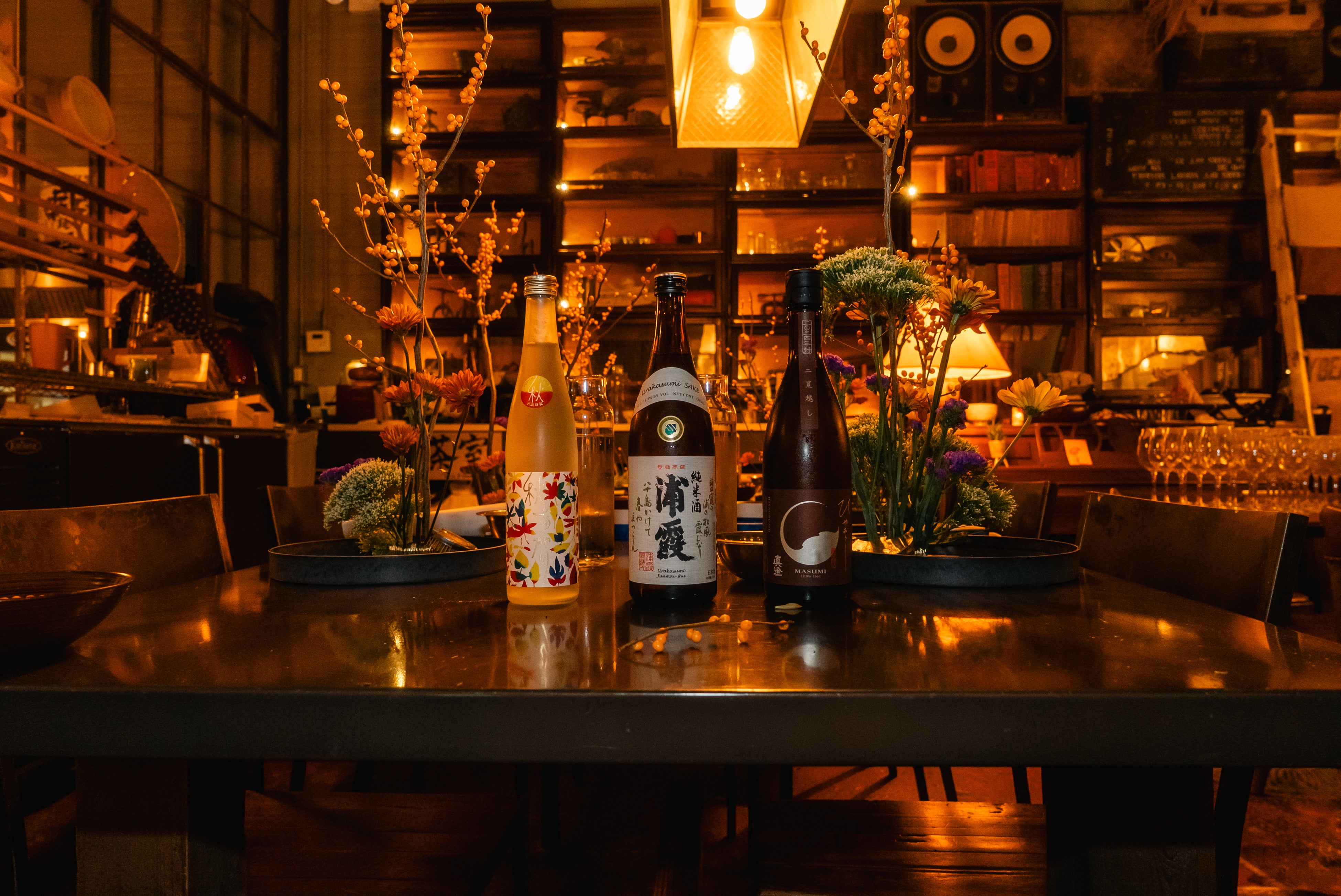 Ikebana installation and sake bottles creating a single cultural table experience: Ikebana × Sake × Soba.