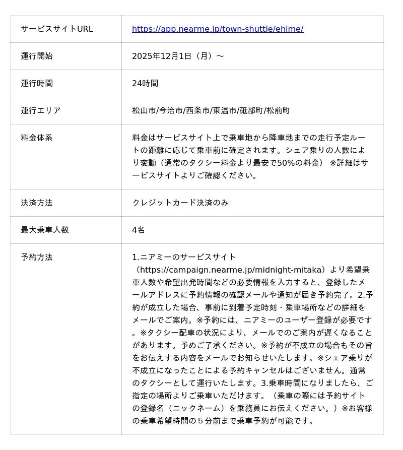 移動の課題に取り組むソーシャルデザインカンパニー、株式会社NearMe(本社:東京都中央区、代表取締役社長:高原幸一郎、以下「ニアミー」)は、四国交通株式会社(本社:愛媛県松山市、代表取締役:大西 匡尚、以下「四国交通」)との連携のもと、本日、2025年12月1日(月)より、愛媛県の松山市・今治市・西条市・東温市・砥部町・松前町の6市町にて独自AIを活用したタクシーの運行を開始します。
