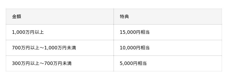 - 期間中に300万円以上ご購入いただいた方- ご購入のご資金が、当行に新たにお預入れいただくご資金であること※当行と既にお取引いただいているご資金でのご購入は対象外