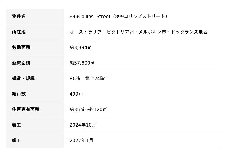 東京建物株式会社(本社:東京都中央区、代表取締役 社長執行役員 小澤 克人、以下「東京建物」)は、今般、オーストラリア・メルボルンにおける賃貸住宅開発プロジェクト「899Collins Street」(以下「本プロジェクト」)に参画しましたので、お知らせします。