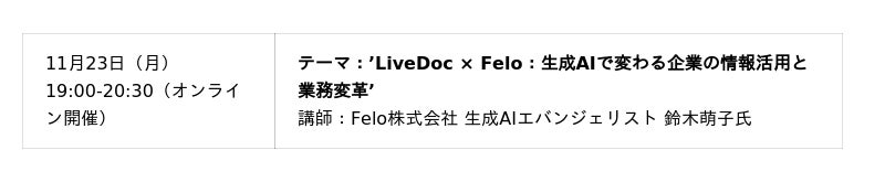今回のウェビナーでは、Felo株式会社の生成AIエバンジェリストである鈴木萌子氏にご登壇いただき、日本語に最適化されたAI検索「Felo」と、資料・議事録・規程類を“生きたドキュメント”に変える新機能「LiveDoc」についてご紹介いただきました。