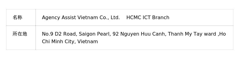株式会社エージェンシーアシスト(日本本社:京都府久世郡、代表取締役社長:増井祐介)のグループ会社Agency Assist Vietnam Co., Ltd. (本社:タイニン省、CEO:佐藤崇広)は、ベトナムホーチミン市に新たな拠点HCMC ICT Branchを開設し、2025年10月1日より本格稼働を開始したことをお知らせします。
