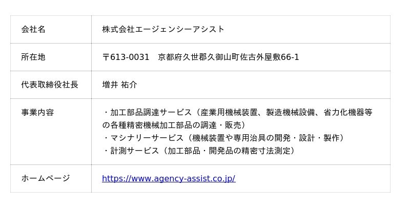 株式会社エージェンシーアシストは、1990年の創業以来、加工部品専門商社のパイオニアとして、加工から検査まで一貫した独自の「加工部品調達サービス」を提供し、2025年12月に創業35周年を迎えました。ものづくり業界における頼れるパートナーを目指し、「加工部品調達サービス」に加え、機械装置や専用治具の設計・開発・製作を担う「マシナリーサービス」、長年培った品質検査のノウハウを活かし受託測定企業として「計測サービス」を展開しています。