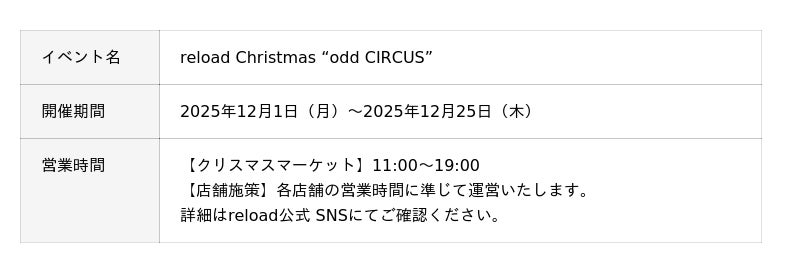 他にも、reloadの空間全体を使ったクリスマス装飾やクリスマスマーケット、個性豊かな店舗による期間限定メニューやキャンペーンなどクリスマスシーズンを盛り上げる施策が盛りだくさん。期間中にぜひご来店ください。