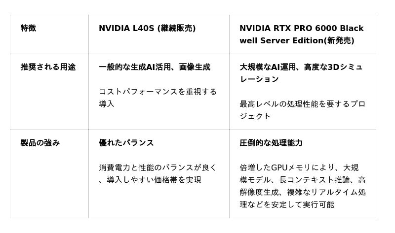 これにより、お客様は「コストと電力効率のバランスに優れたL40S」と「圧倒的な処理性能を持つRTX PRO 6000 Blackwell Server Edition」の2つの選択肢から、事業規模や用途に合わせて最適なサーバー環境を選択可能となります。