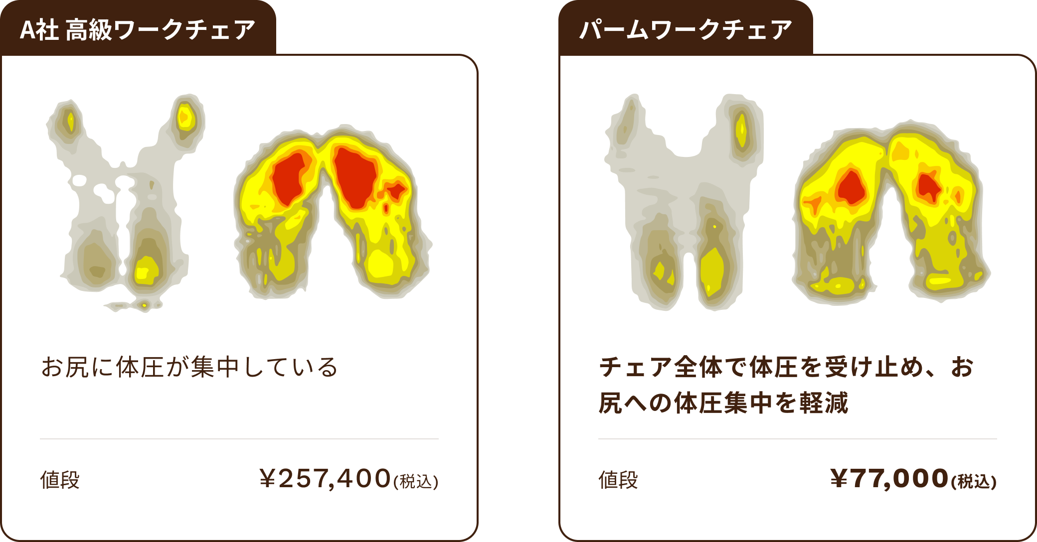 驚くべきことにパームワークチェアは、チェア全体へ適切に体圧を分散する設計によって、体圧分散値の測定において25万円を超える高級ワークチェアより優れた結果を記録しました。からだを支えるお尻や腰、背中の負担を軽減します。
