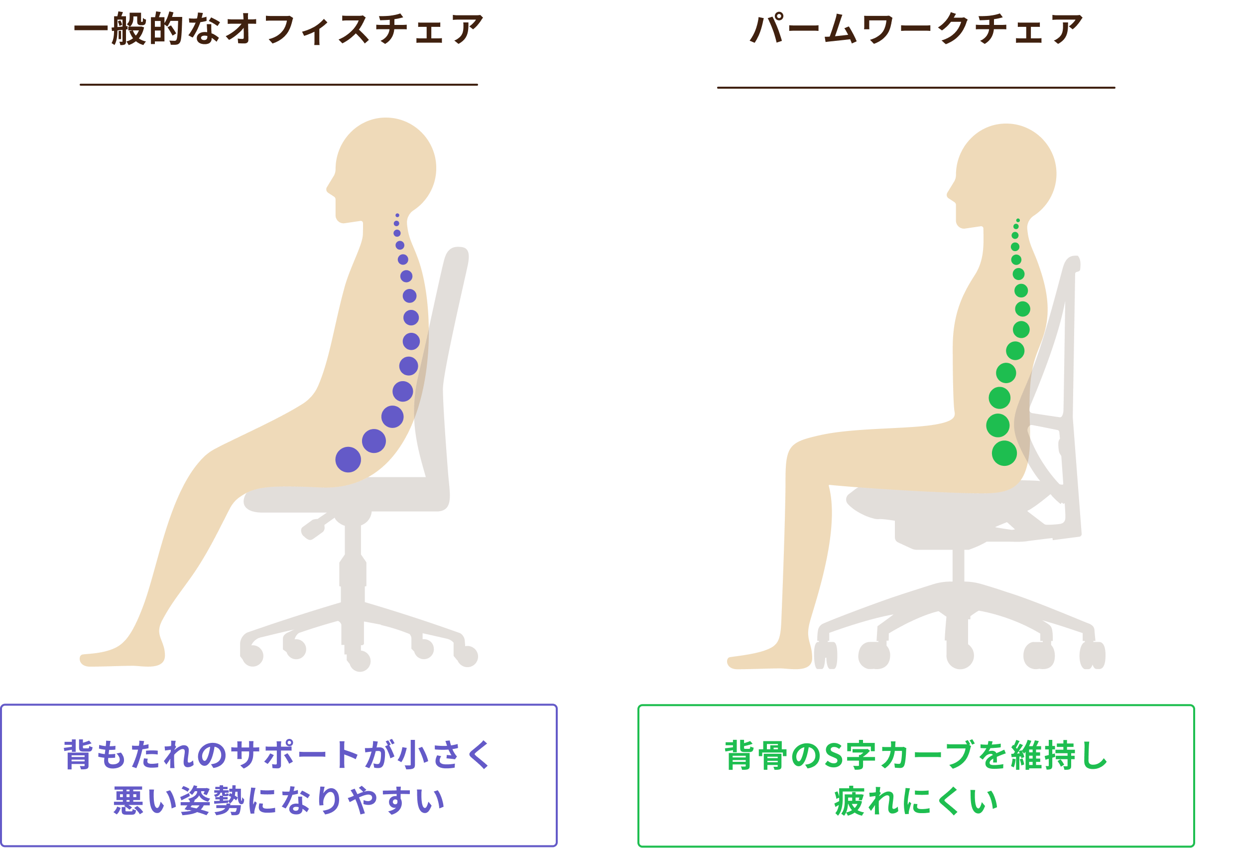 パームワークチェアは、「背骨のS字カーブの維持」に着目。背骨に寄り添い、S字カーブを維持する背もたれによって、からだへの負担を軽減します。