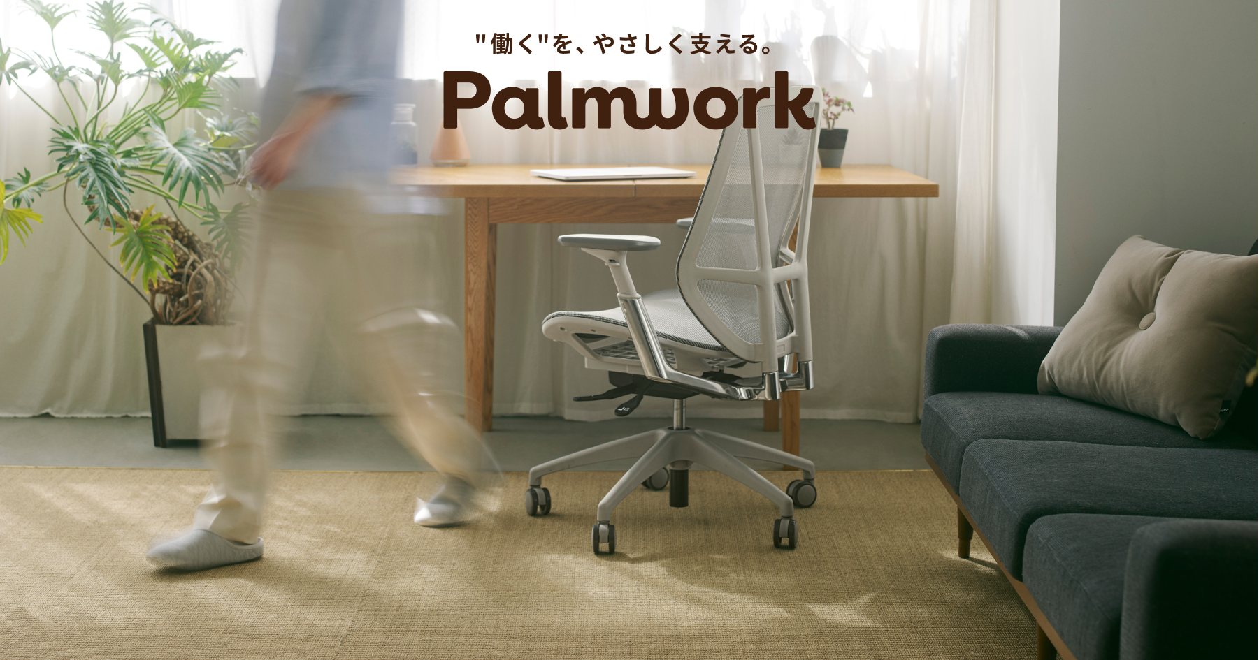 Palmworkは、「"働く"を、やさしく支える。」をコンセプトに、リモートワーク環境における課題を解決するために生まれた、あたらしいホームオフィスブランドです。