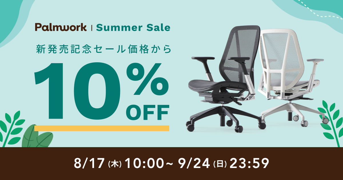 そこでPalmworkは、暑さが続く日々の中でもしっかり働くあなたをサポートするため、夏のリモートワークに欠かせない「パームワークチェア」が新発売記念セール価格からさらに10%OFFとなる、"Palmwork Summer Sale"を実施いたします。