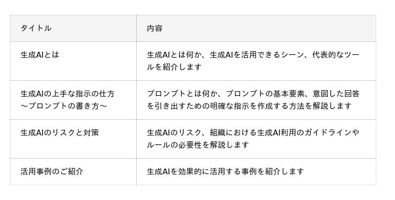- 「生成AIとは何か」、「具体的にどのようなことができるのか」といった基本的なご質問への対応- 生成AIツールを使い始めるにあたってのログインやアカウント登録の方法- お客さま企業で生成AIツールを運用するうえでの、セキュリティリスクや運用ガイドラインの制定に関する考え方のご説明