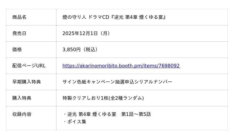 株式会社ワールドエッグス(本社:東京都港区、代表取締役社長:波房克典)は、灯台擬人化プロジェクト『燈の守り人』のボイスドラマシリーズ『逆光 第4章 煙くゆる宴』のドラマCDを2025年12月1日(月)に発売開始いたします。