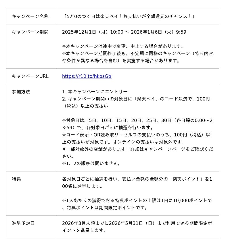 楽天ペイメント株式会社(以下「楽天ペイメント」)は、キャッシュレス決済サービス「楽天ペイ」において、「5と0のつく日は楽天ペイ!お支払いが全額還元のチャンス!」キャンペーンを、2025年12月1日(月)から2026年1月6日(火)まで(注1)実施することをお知らせします。