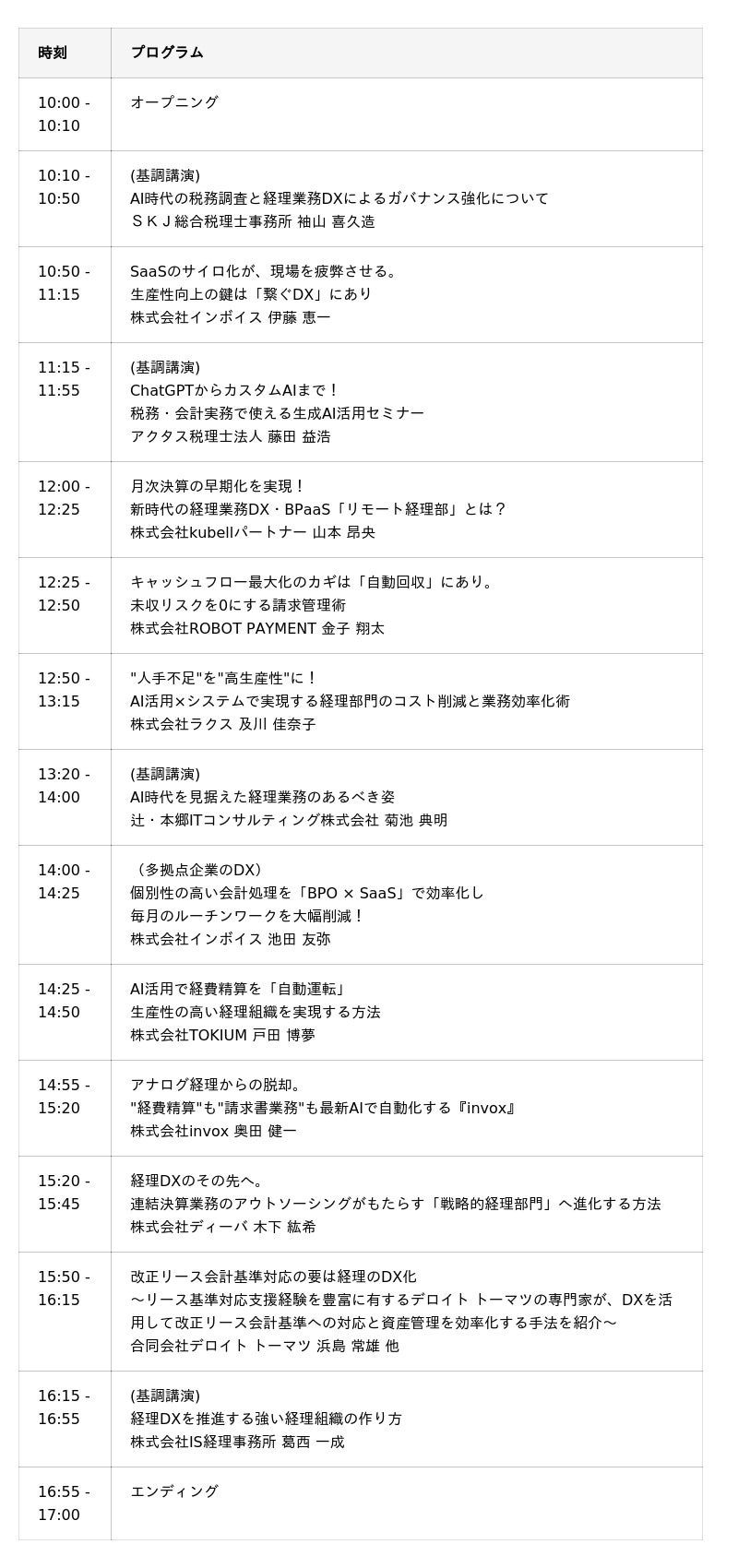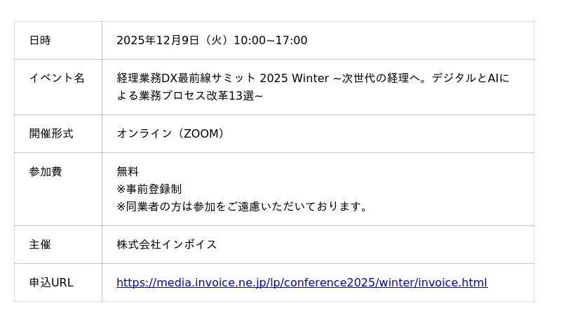 この度、株式会社インボイス(本社:東京都千代田区、代表取締役社長:仁多見 斎 、以下「インボイス」)は、2025年12月9日(火)に開催する無料オンラインカンファレンス【経理業務DX最前線サミット 2025 Winter ~次世代の経理へ。デジタルとAIによる業務プロセス改革13選~】の全プログラムが決定したことをお知らせいたします。