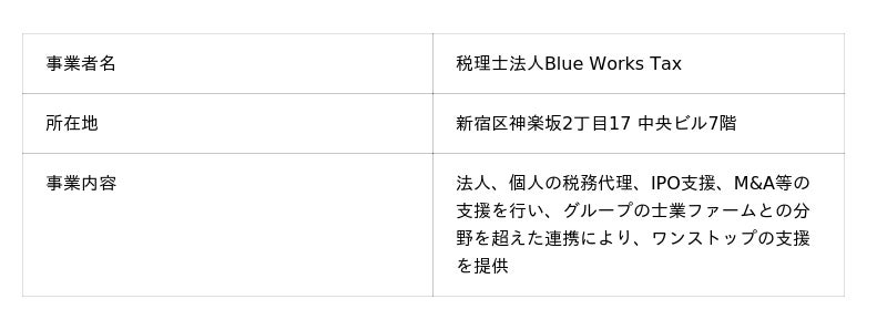 税理士法人Blue Works Taxは、国内に複数拠点を構え、公認会計士・税理士・弁護士が結集するワンストップのプロフェッショナルファーム「BlueWorksグループ」のメンバーファームである税理士法人です。法人、個人の税務代理、IPO支援、M&A等の支援を他のメンバーファームとの協業関係のもと、ワンストップで提供しています。