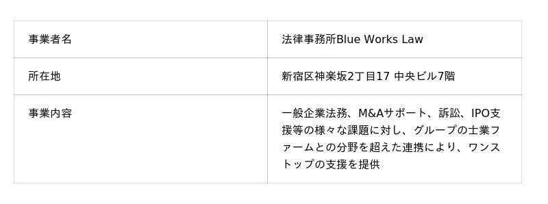 法律事務所Blue Works Lawは、公認会計士・税理士・弁護士が結集するワンストップのプロフェッショナルファーム「BlueWorksグループ」のメンバーファームである法律事務所です。 一般企業法務、M&Aサポート、訴訟、IPO支援等幅広い業務領域を、他のメンバーファームとの協業関係のもと、ワンストップで提供しています。