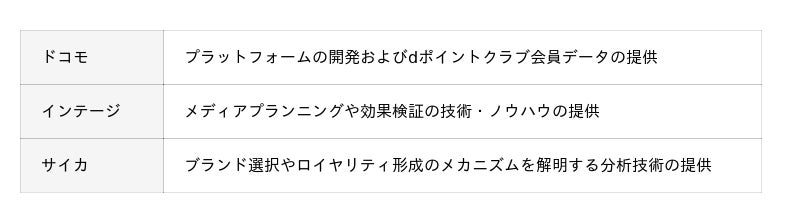 ドコモのdポイントクラブ会員のシングルIDをキーに統合されたデータ(※2)や、インテージの購買データ分析や施策の効果検証に関する知見、サイカの消費者意識データ(※3)から顧客のブランド選択やロイヤリティ形成のメカニズムを解明する分析技術など、各社のデータや技術・ノウハウを連携した本プラットフォームの提供をめざします。