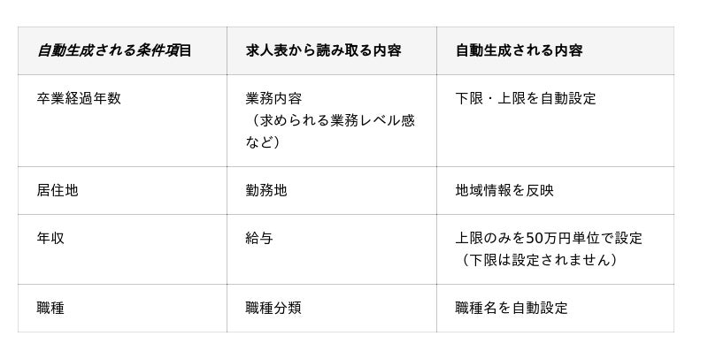 これまで、採用担当者がスカウト対象者選定のために手入力をする必要があった「卒業経過年数」「居住地」「年収」「職種」の4つの条件項目を、求人票に記載された業務内容(求められる業務レベル感など)や勤務地、給与、職種分類を読み込むことで自動生成します。また、直感的でわかりやすい画面設計になっているため、ダイレクトリクルーティング活動がはじめての企業でも、すぐに利用開始が可能です。