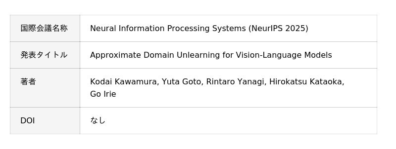 事前学習済み大規模視覚言語モデル (Vision-Language Model: VLM)に対して、特定のドメインに属するデータだけを認識できないように“忘却”させる『近似ドメインアンラーニング (Approximate Domain Unlearning: ADU)』技術を世界で初めて提案・創出しました。